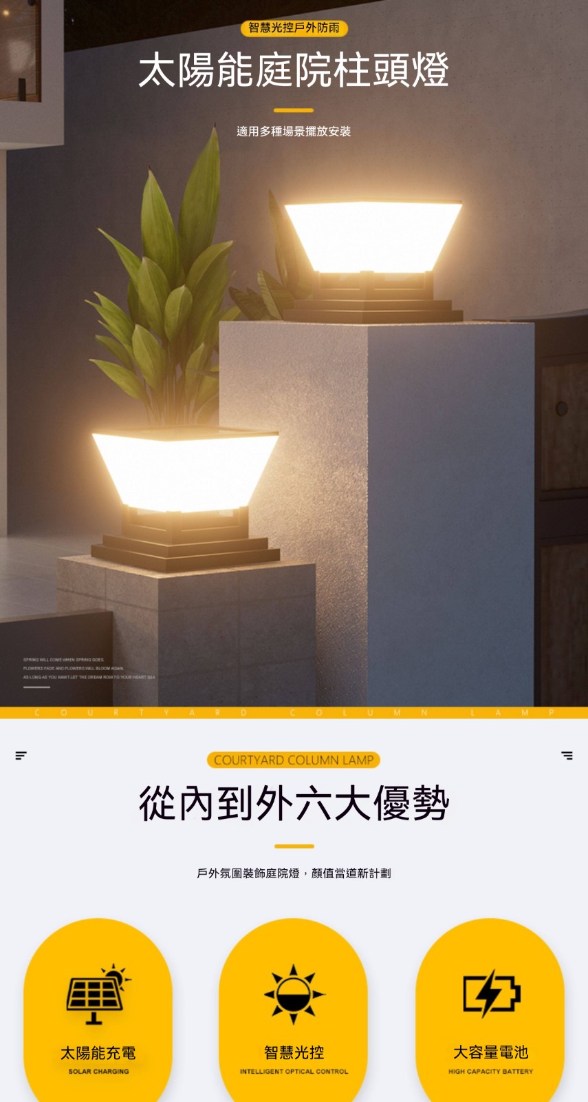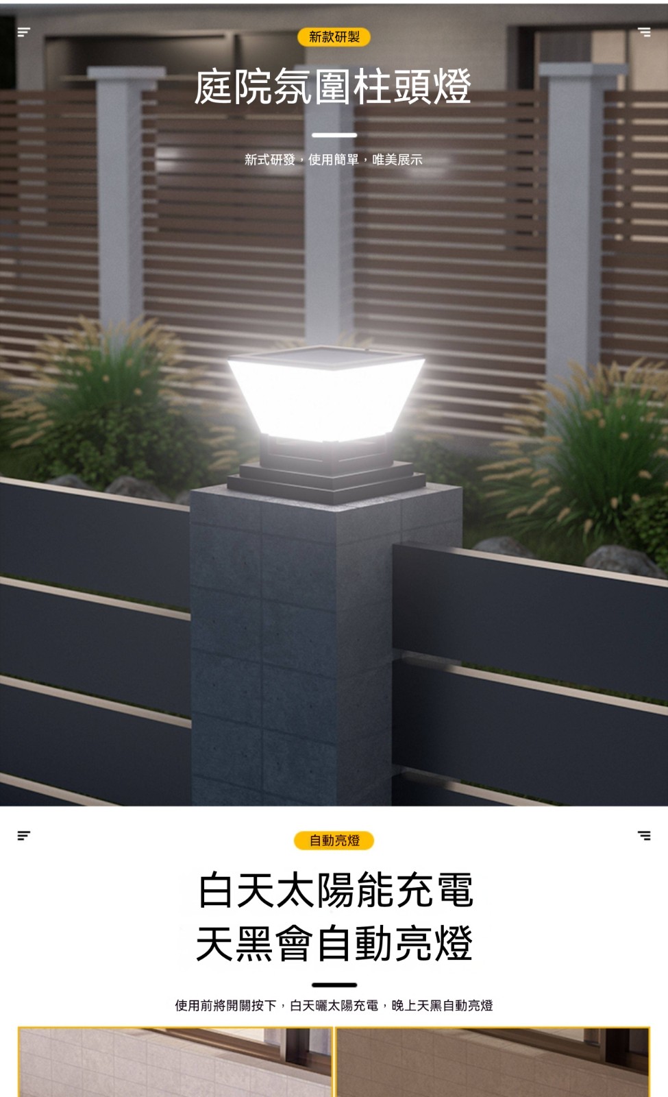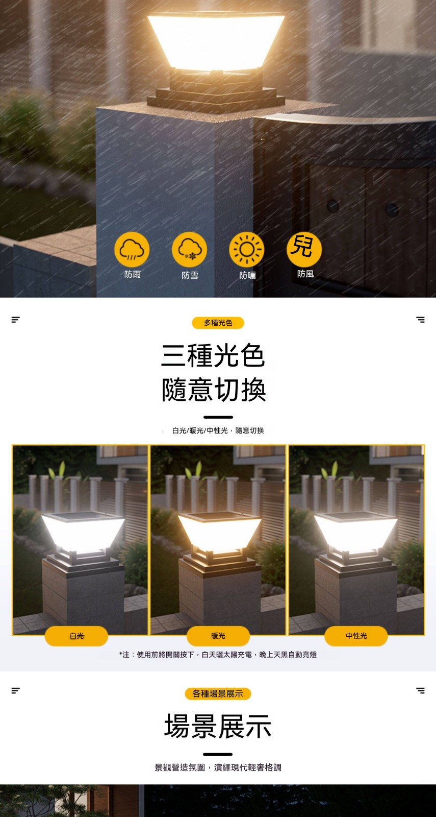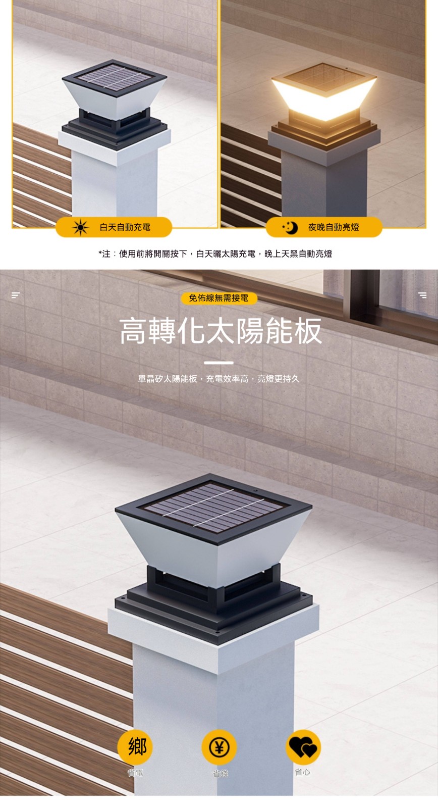 太陽能庭院柱頭燈|免佈線0電費✅智能光控自動亮燈✅ 白天充電、夜晚亮燈,三種光色隨心切換!✅ 為你的庭院增添浪漫氛圍,生活儀式感滿分!