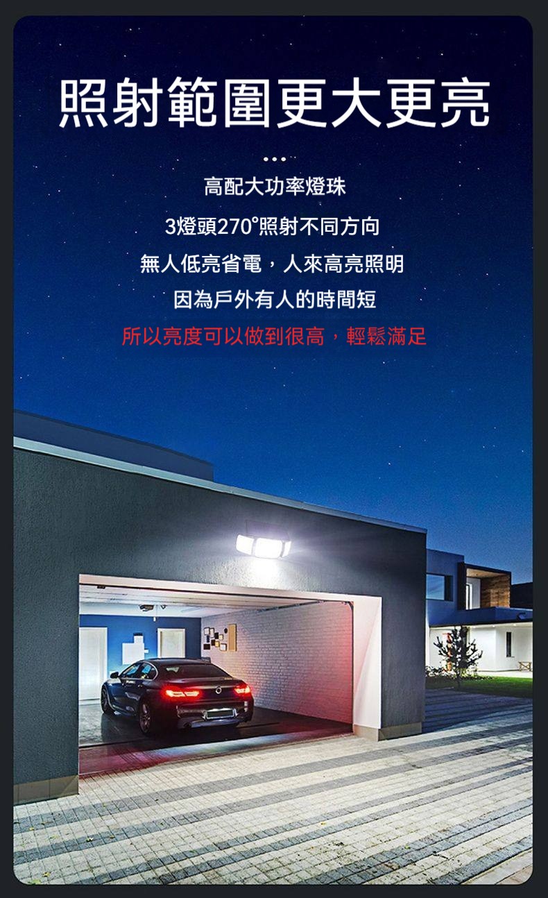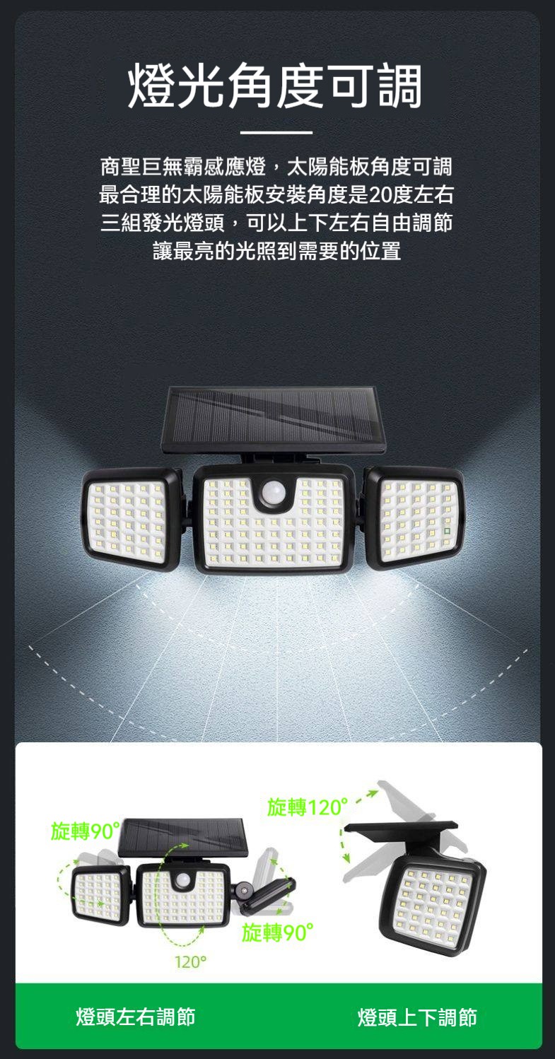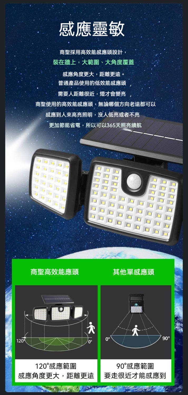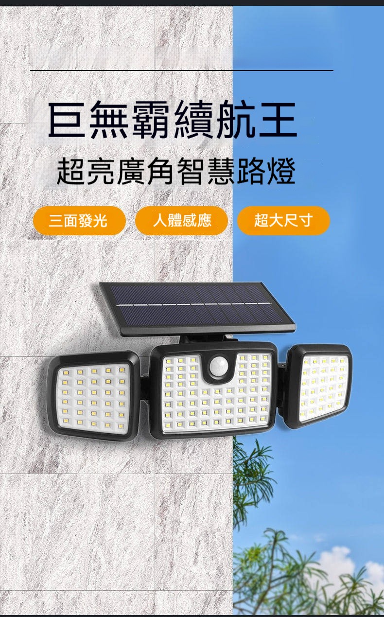 巨無霸太陽能感應燈|三燈頭270°超廣角照明✨ 365天免電費|人來高亮、無人省電|連續陰雨天也亮整夜! 庭院/車庫/巷弄/圍牆,一盞就夠亮!