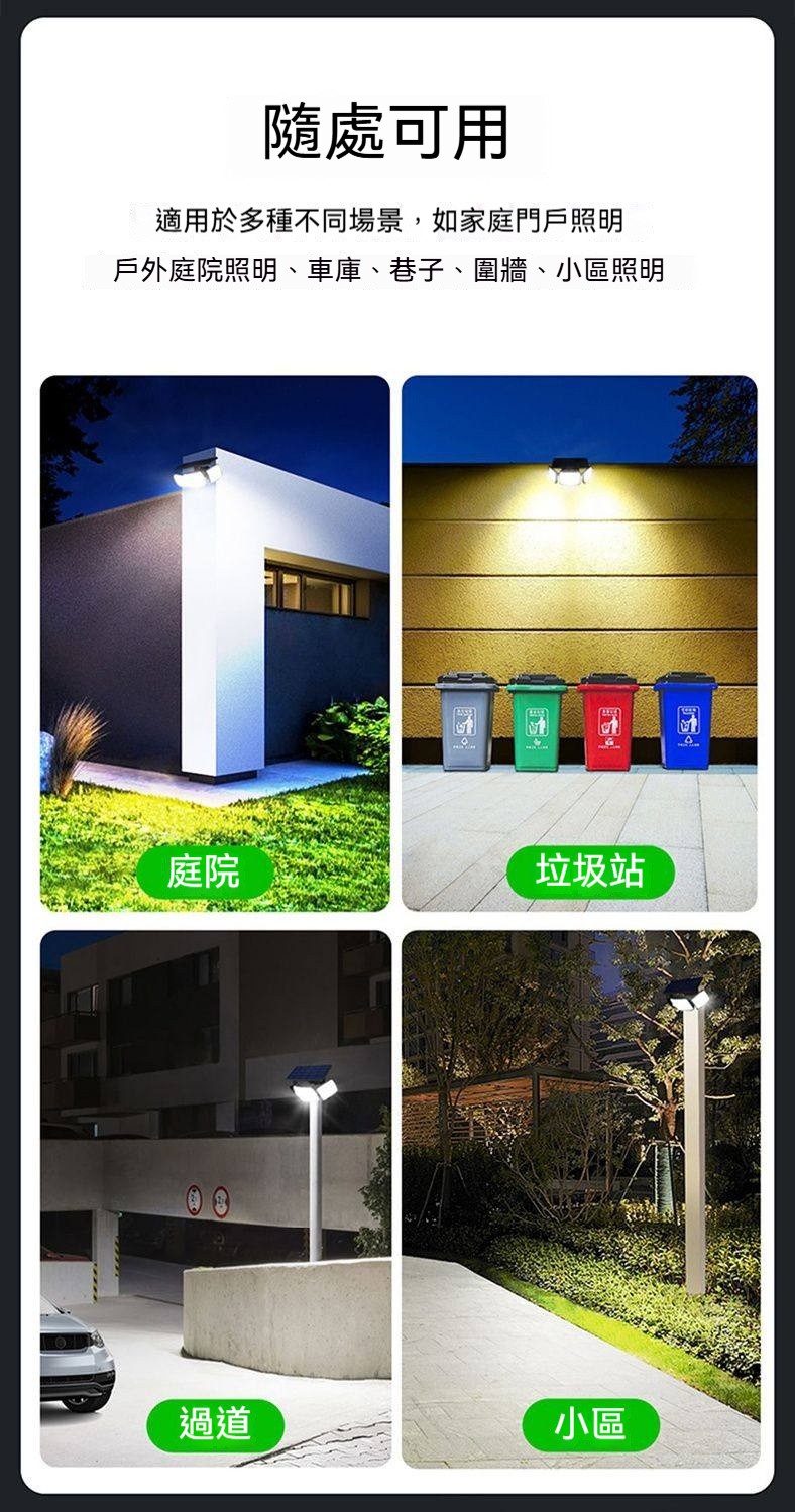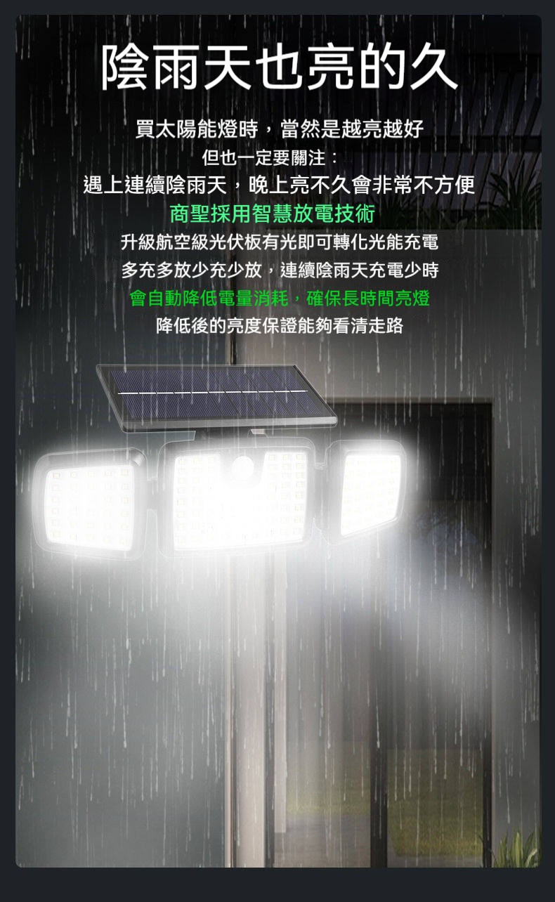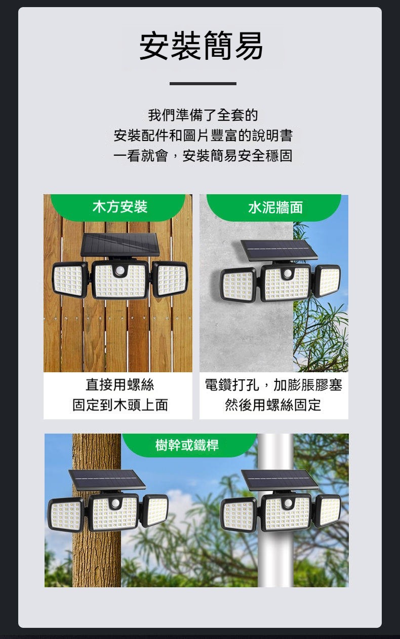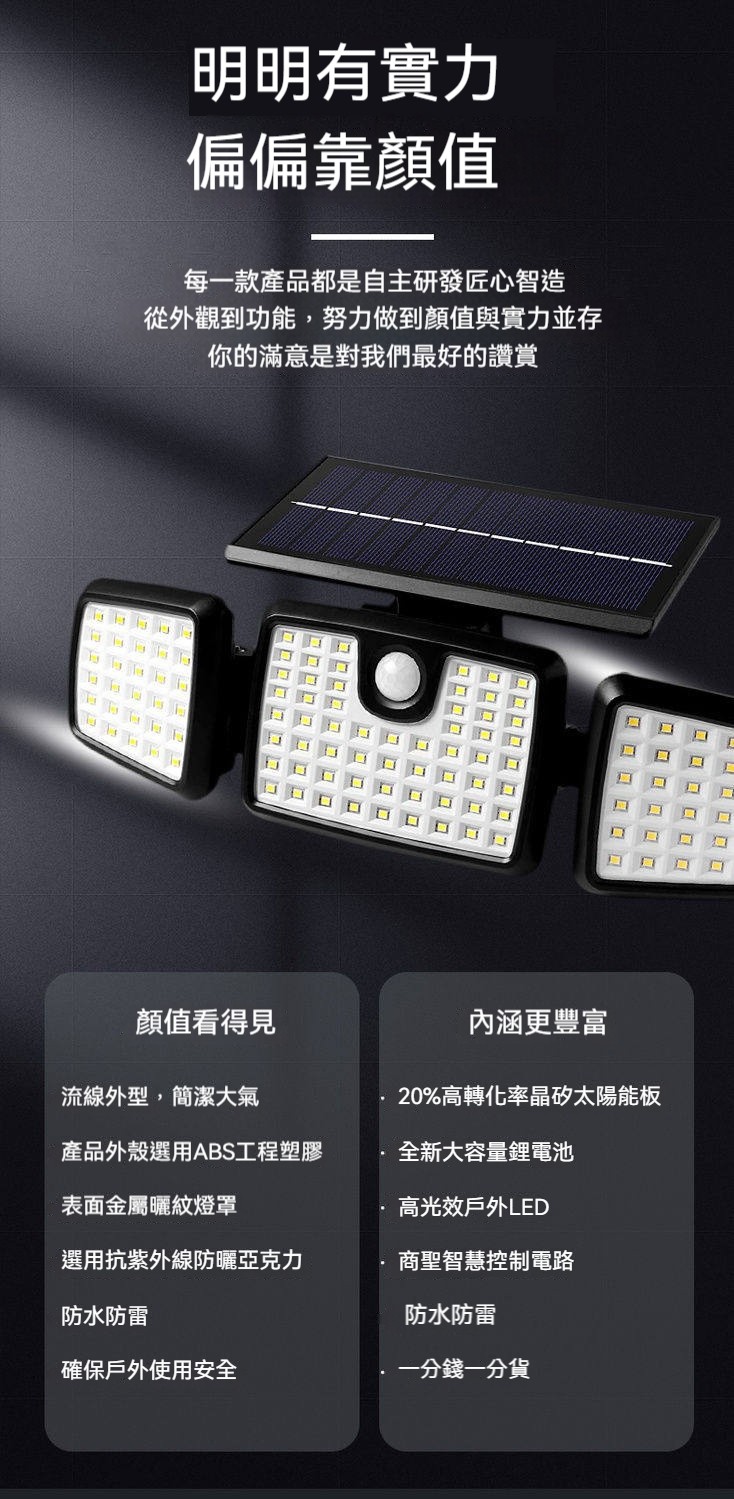 巨無霸太陽能感應燈|三燈頭270°超廣角照明✨ 365天免電費|人來高亮、無人省電|連續陰雨天也亮整夜! 庭院/車庫/巷弄/圍牆,一盞就夠亮!