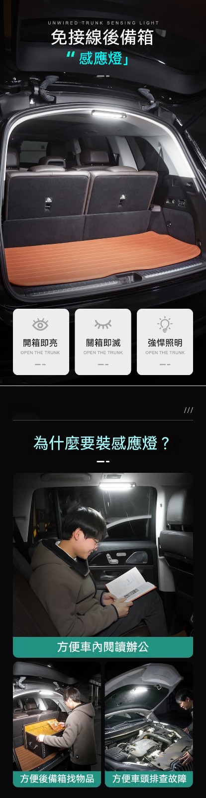免接線後備箱感應燈|2026年全新升級✨ 開箱即亮、關箱即滅!人體感應超靈敏! 3M強磁吸附+500mAh續航50天,夜間找東西不再摸黑!